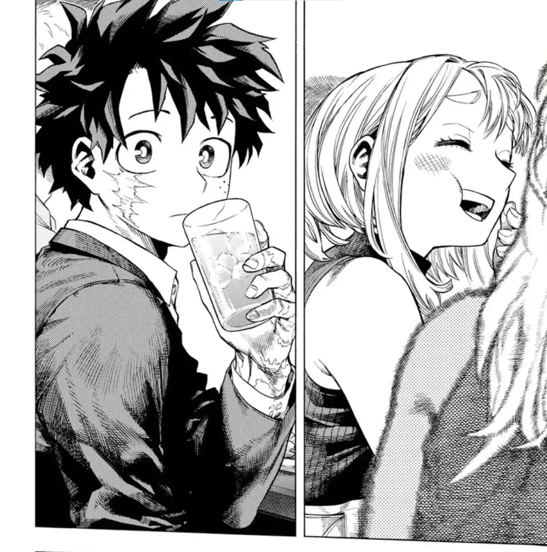 Midoriya e All MightExistia um interesse romântico que autor deixa a entender, entre o personagem principal, Midoriya, e sua amiga e colega de classe, Uraraka. Contudo no final da obra, o autor deixou a relação em aberto e sem muita evolução na verdade, abrindo uma janela para várias teorias de fãs.Deku e Uraraka (capítulo extra)A obra termina com Midoriya se formando no colégio e virando professor, agora sem poderes. Seus amigos no entanto continuam como hérois e com carreiras já consolidadas, por meio dos mesmos, que se organizaram e fizeram uma armadura, igual a do All Might na temporada final, Deku agora pode mais uma vez, se juntar a seus amigos como antigamente.All Might entregando armadura para MidoriyaUm ponto positivo, que tem de ser destacado é a animação. Não tem o que falar quanto a isso, o estúdio investiu pra valer e dessa vez não fizeram um filme ao mesmo tempo para dividir os recursos da temporada final. Nessa última temporada realmente teve momentos bem feitos, bem empolgantes e bem dirigidos. A parte técnica foi feita com muita qualidade.